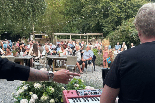 I vår trädgård kan du skapa en härlig inramning och en härlig känsla. På verandan riggar vi upp scenen och i trädgården minglar och samlas publiken. Upp till 500 personer kan sätta sig i trädgården och få en konsert som blir helt unik.